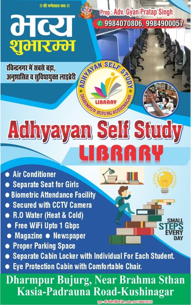ग्रामीण अंचल में शिक्षा के क्षेत्र में नई रोशनी फैलाती हुई “अध्ययन सेल्फ स्टडी लाइब्रेरी” छात्रों के लिए एक प्रेरणादायक पहल बनकर उभरी है। धर्मपुर बुजुर्ग (कुशीनगर) में स्थित यह लाइब्रेरी उन छात्रों के लिए वरदान सिद्ध हो रही है, जिन्हें अब तक सुविधाओं के अभाव में उचित माहौल नहीं मिल पाता था।