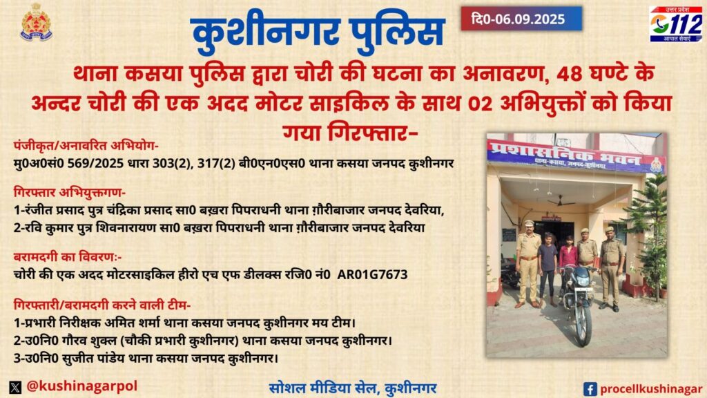 कुशीनगर में पुलिस का करारा वार! 48 घंटे में चोरी का पर्दाफाश, मोटरसाइकिल समेत 02 शातिर चढ़े हत्थे 🚨