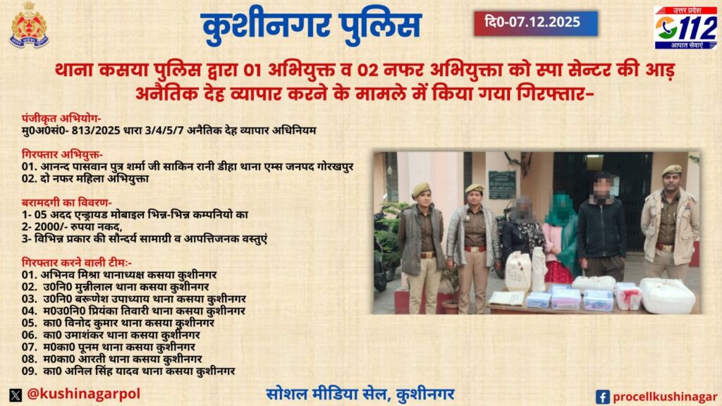 कुशीनगर, 07 दिसम्बर। अपराध और अवैध गतिविधियों पर नियंत्रण के लिए चलाए जा रहे अभियान के तहत कसया पुलिस ने रविवार को एक स्पा सेंटर पर छापेमारी कर अनैतिक देह व्यापार का भंडाफोड़ किया। छापेमारी के दौरान पुलिस ने एक युवक सहित दो महिलाओं को गिरफ्तार किया तथा स्पा सेंटर को सील कर दिया।