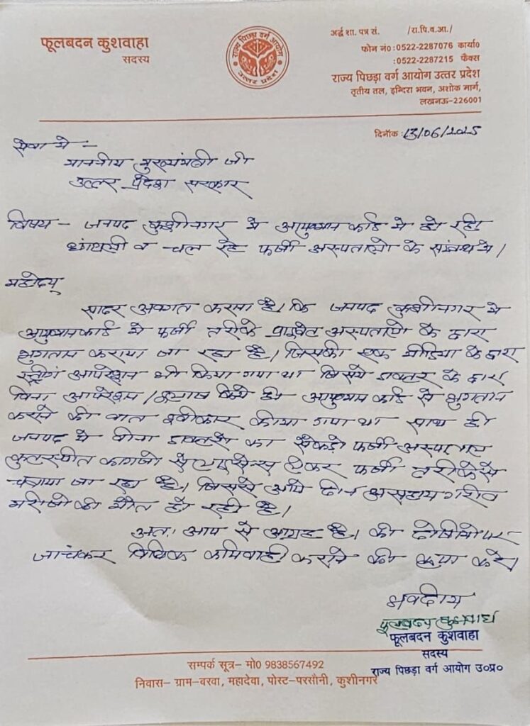 श्री कुशवाहा ने मुख्यमंत्री को सौंपे गए पत्र में लिखा कि कुशीनगर जिले में बिना इलाज या ऑपरेशन के लाखों रुपये का फर्जी भुगतान आयुष्मान कार्ड के नाम पर किया जा रहा है। उन्होंने यह भी उल्लेख किया कि जिले में दर्जनों अस्पताल बिना किसी पंजीकरण या मापदंडों के संचालन कर रहे हैं।